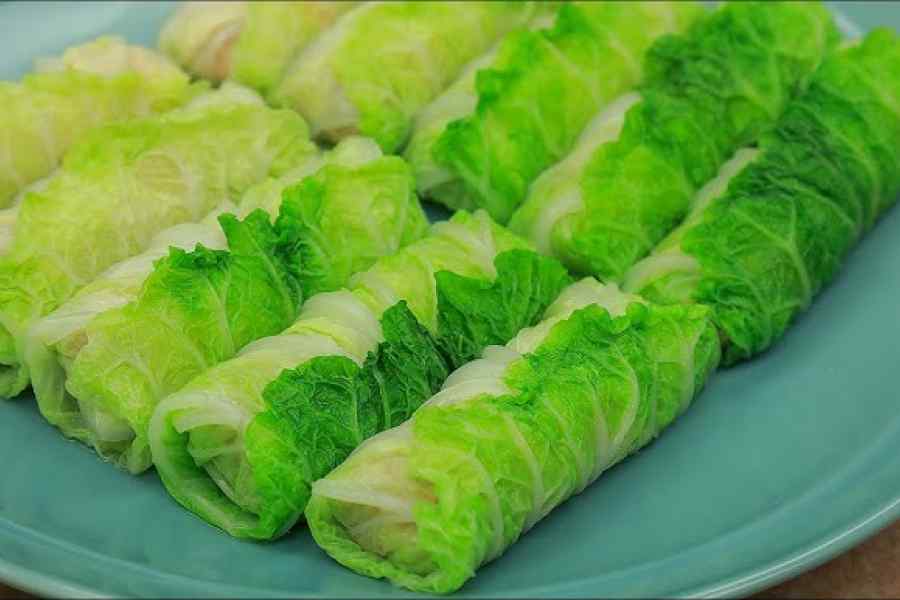 একটি বড় পাত্রে জল গরম করুন। জল ফুটলে তাতে সামান্য নুন দিন। বাঁধাকপির পাতাগুলি সাবধানে ছাড়িয়ে গরম জলে ২-৩ মিনিটের জন্য ব্লাঞ্চ করে নিন (একটু নরম করার জন্য)।পাতাগুলি জল থেকে তুলে ঠান্ডা জলে ডুবিয়ে সঙ্গে সঙ্গে তুলে নিন। এতে পাতার সবুজ রং বজায় থাকবে। পাতাগুলি একটি পরিষ্কার কাপড়ে শুকিয়ে নিন।