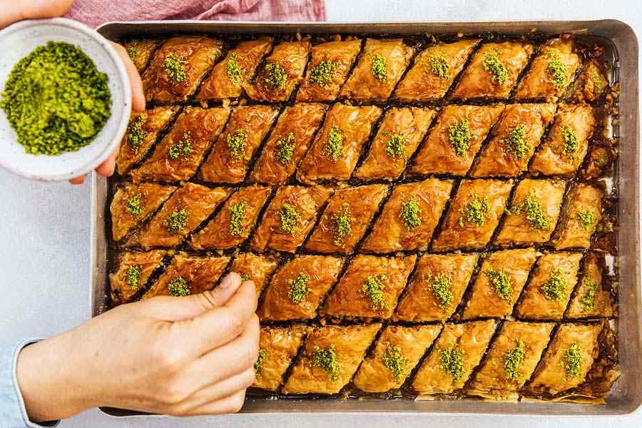 প্রথমে ১০ মিনিট ওভেন ১৮০ ডিগ্রিতে প্রিহিট করে নিতে হবে। তারপর বাকলাভা তৈরির পাত্রের আকারে ফিলো শিটগুলো কেটে নিন। এবার বেকিং ট্রেতে বাটার ব্রাশ করে একে-একে ১০টা ফিলো শিট বিছিয়ে দিতে হবে। লক্ষ্য রাখবেন প্রতিটা ফিলো শিটে বাটার ব্রাশ করার পর শিটগুলো উলটে বিছাতে হবে, যেন বাটারের সাইডটি নিচের দিকে থাকে। এবার কাঠবাদাম কুঁচি ছড়িয়ে আবার ফিলো শিট দিয়ে দিতে হবে। এবার এর উপর হালকা করে বাটার দিয়ে দিন। এখন বাকি শিটগুলো ঠিক একইভাবেই ব্রাশ করে বিছিয়ে দিতে হবে। তারপর ১৫ মিনিট ওভেনে বেক করুন। ১৫ মিনিট পর ধারালো ছুড়ি দিয়ে পছন্দমতো শেপে কেটে নিন। তারপর আবার ১৫ মিনিটের জন্য ওভেনে বেক করে নিতে হবে। এতে উপরের লেয়ারটি গোল্ডেন ব্রাউন রঙের হবে। ১৫ মিনিট পর আবার শেপ অনুযায়ী কেটে নিন এবং ২ ঘন্টা ধরে ঠাণ্ডা হতে দিন। এই সময়ের মধ্যে আবার চিনির শিরা তৈরি করে ফেলুন। শিরা তৈরি করতে ১ কাপ চিনি ও ১ কাপ জল দিয়ে ওভেনে বসিয়ে দিতে হবে। ফুটে উঠলে এতে লেবুর রস, লেবুর খোসা গ্রেট করে দিন। এতে সুন্দর একটি ফ্লেভার আসবে। তারপর গরম শিরা ঠান্ডা বাকলাভার উপর ছড়িয়ে দিয়ে ফ্রিজে ঠান্ডা হতে দিন।