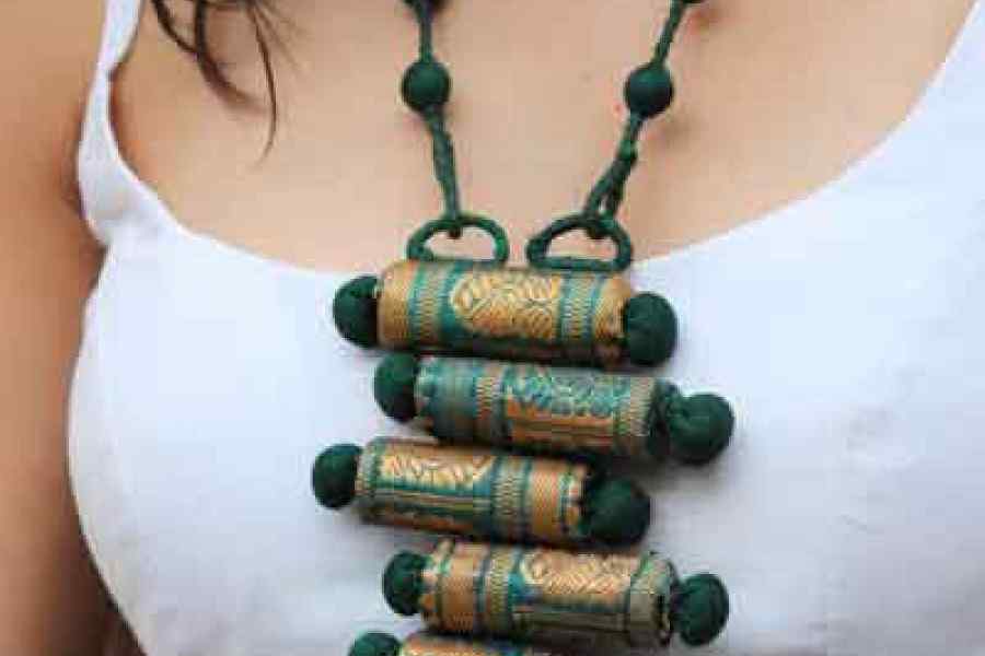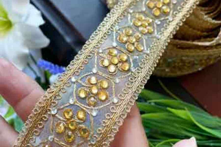 চওড়া জরি পাড় সঙ্গে পাথর, পুঁথির কাজ। আগে এই ধরনের ভারী শাড়ির চল ছিল। বর্তমানে সেই শাড়িই নাকি পুরনো হয়েছে। তার ফলে এখন আর আলমারি থেকে তা নামানো হয় না।দিনের পর দিন আলমারিতে থেকে তা নষ্ট। অন্য উপায়ে এই শাড়িগুলিকে কাজে লাগাতে পারেন। উৎসবের মরশুমে ওই শাড়িগুলির জরি পাড় দিয়ে তৈরি করতে পারেন হালফ্যাশনের গয়না।