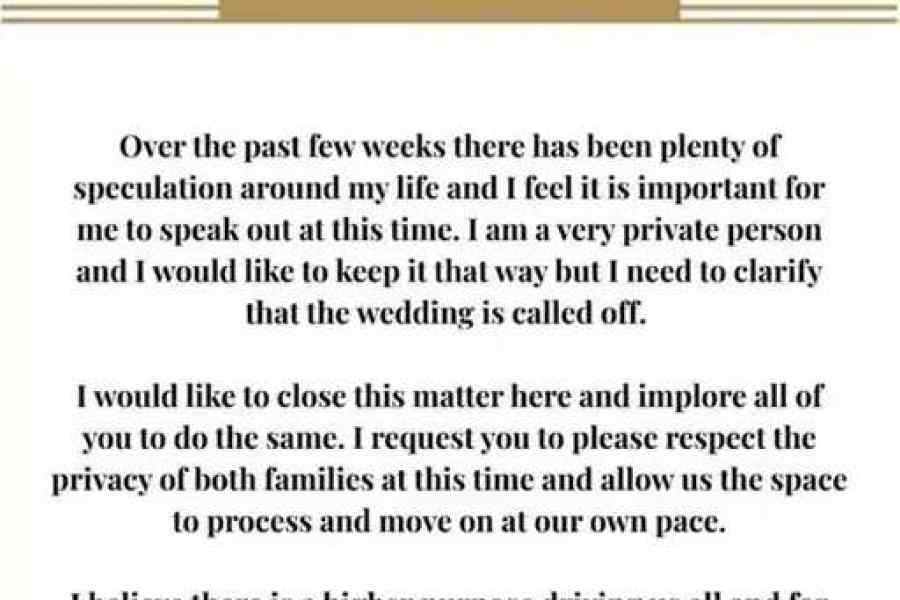 उन्होंने आगे लिखा, :मैं चाहती हूं कि यहीं इस मामले को खत्म कर दिया जाए और आप सभी से भी यही अनुरोध है कि इस विषय को आगे न बढ़ाएं। कृपया इस समय दोनों परिवारों की निजी जिंदगी का सम्मान करें और हमें थोड़ा समय दें, ताकि हम अपनी भावनाओं को संभाल सकें और आगे बढ़ सकें।"